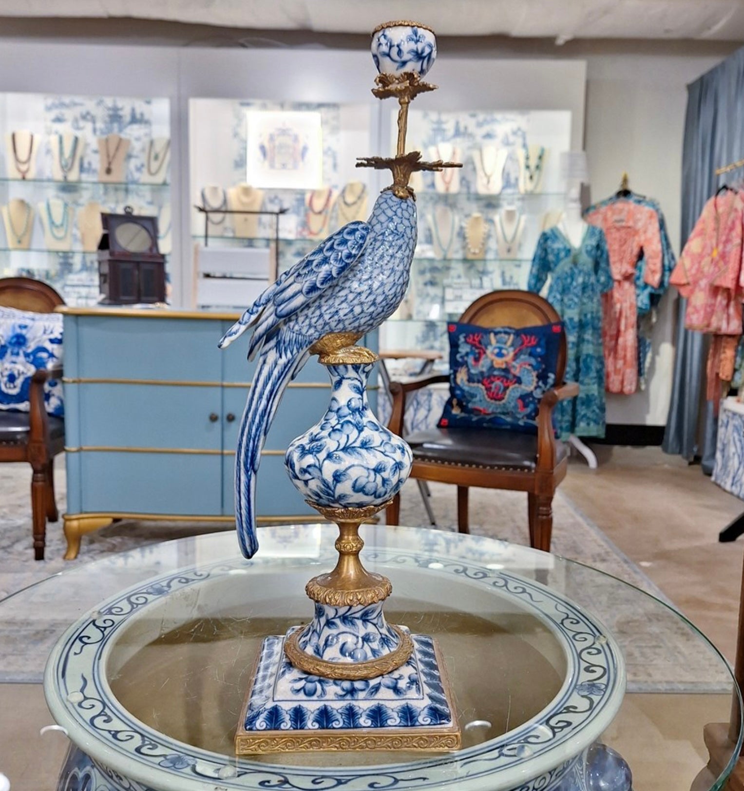 Porcelain blue and white parrot with Bronze ormolu set-right and left candlestick