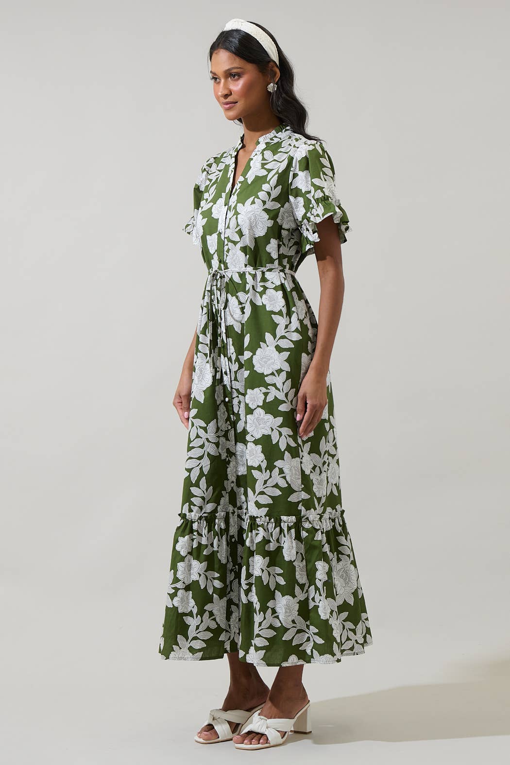 Steal the spotlight at your next event with this eye-catching dress. A green floral print shapes ruffle short sleeves and neck. The front has a button up placket with a mini ruffle hem. Style it with strappy heels and a chic crossbody bag to complete the look.