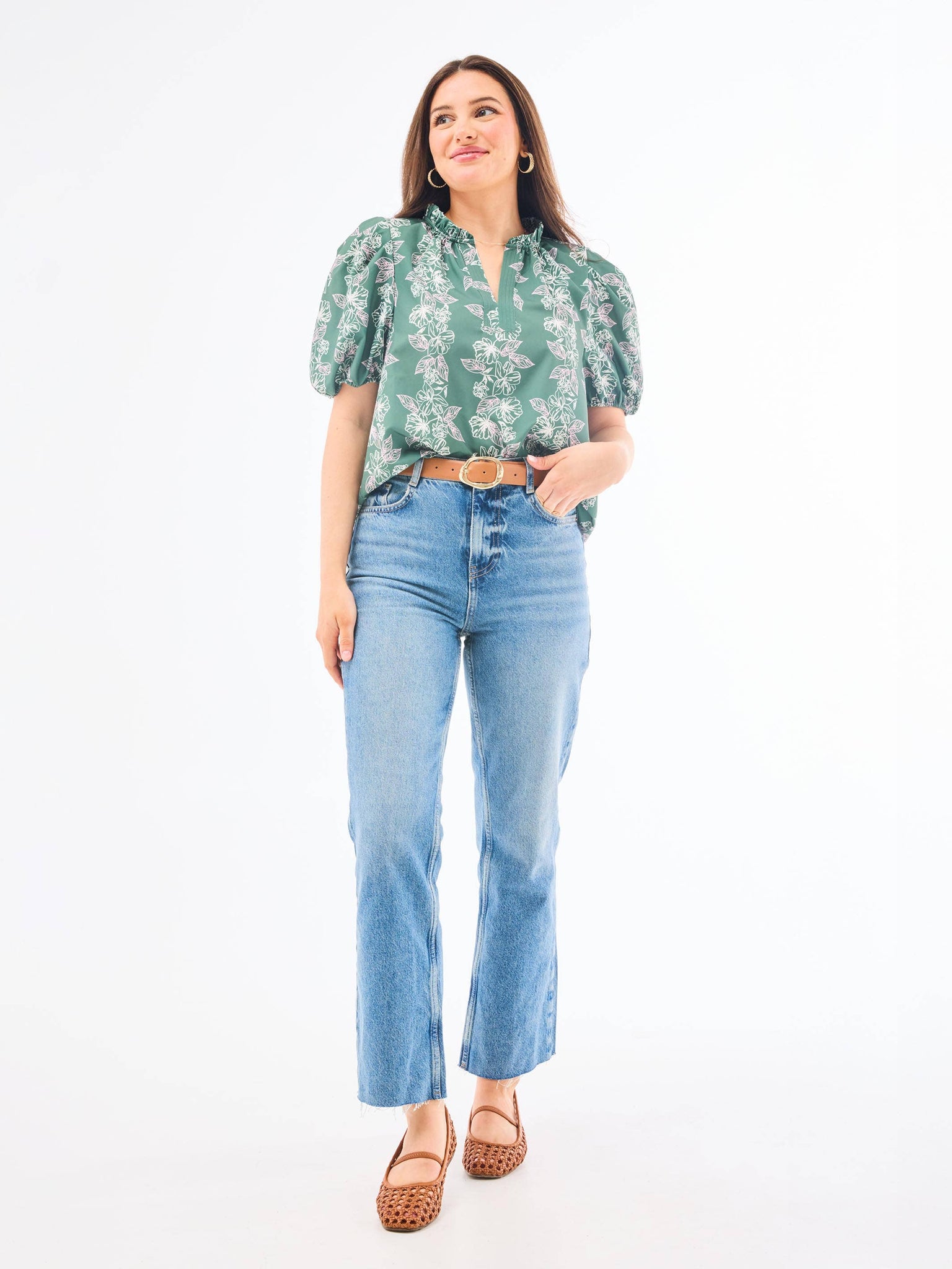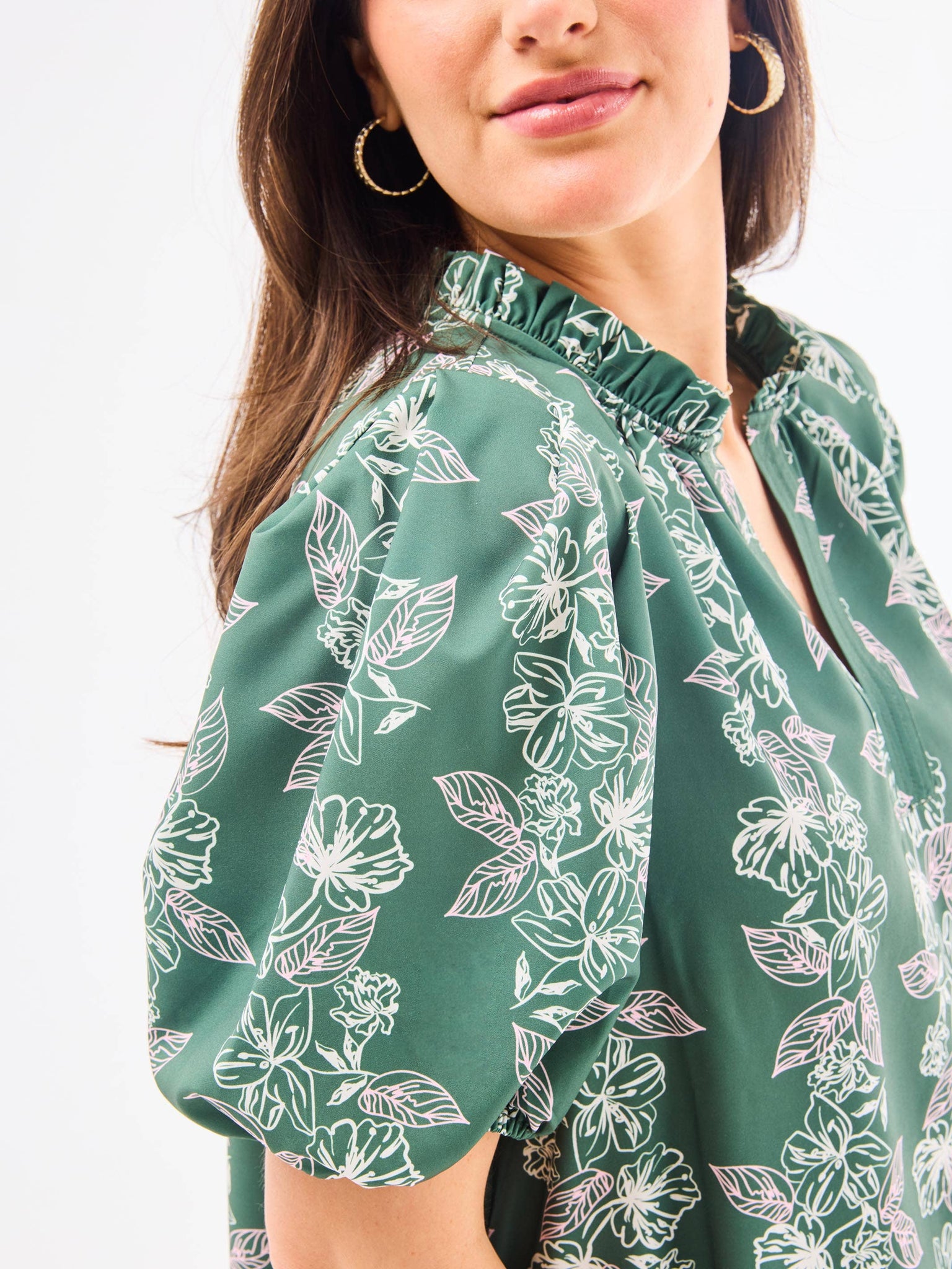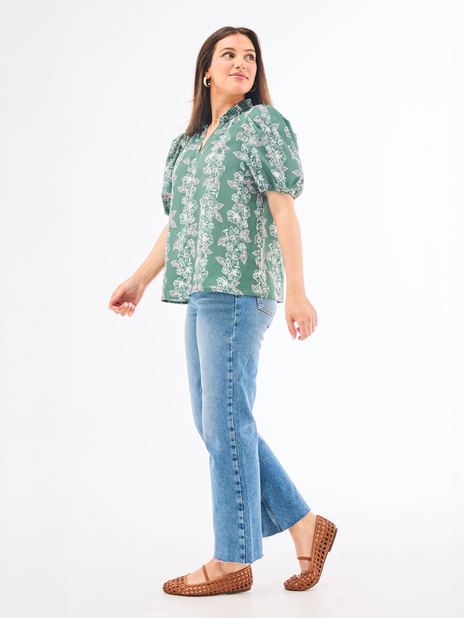 Elevate your everyday style with the Lainey Top. This top features short puff sleeves with elastic for a comfortable yet chic look, while the ruffle split neckline adds a romantic, flowy touch. The stitched placket enhances the top's structured design, giving it a refined and modern feel.