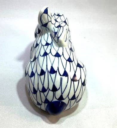 Sweet little bunny figurine is beautifully hand-painted in classic web patterned porcelain. a popular item for many years. She is about 4 inches long and tall. She does not like to be separated from RTEU-R7H, her BFF. Our blue and white comes from the finest craftsmen in Thailand and is always glossy, smooth and deeply colored, unlike the cheaper stuff from China.