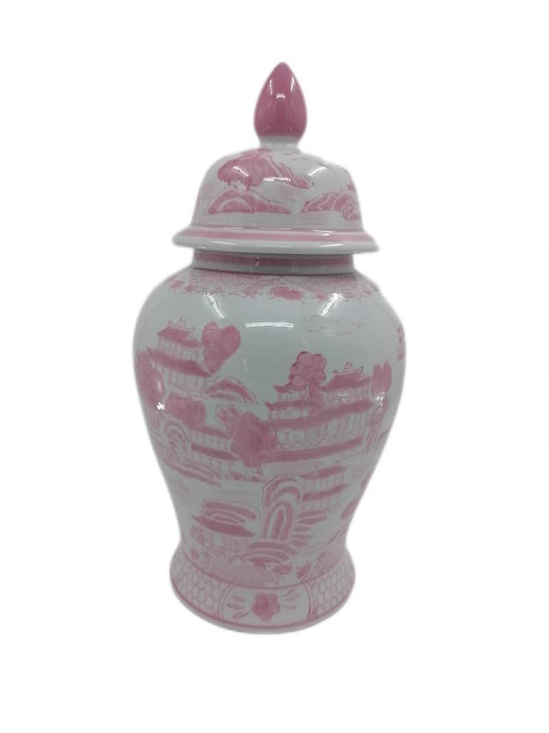 Add a touch of timeless elegance to your home with our Chinoiserie Jar. Crafted from high-quality materials, this beautiful jar features a classic chinoiserie design that will elevate the style of any room. Measuring approximately 18 inches tall, this jar is perfect for use as a decorative accent piece on a shelf or mantel. Its stunning pink and white color palette complements a wide range of decor styles, from traditional to contemporary. This versatile jar is both functional and stylish, making it a great investment for any home. Great gift for Mothers Day! Great piece to start or add to a porcelain collection. Size: 9.8 x 9.8 x 18"H