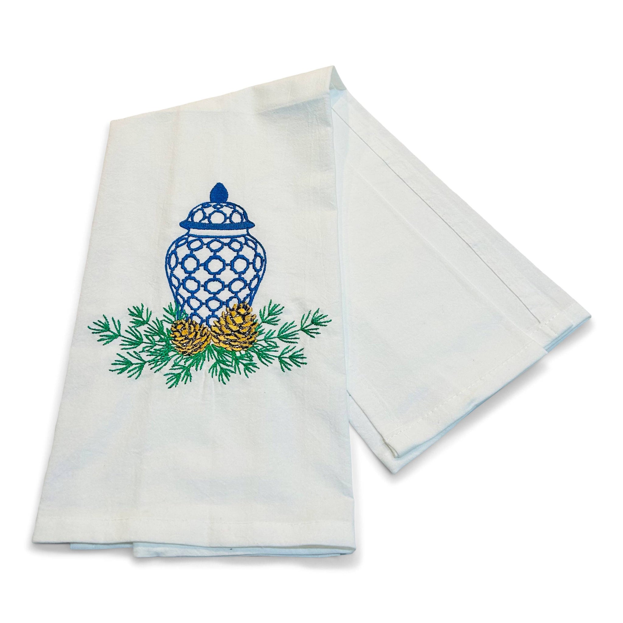 Embrace this elegant look of a ginger jar surrounded by pinecones at its base. Size: 27.5" X 27.5" Flour sack dish towel option.
