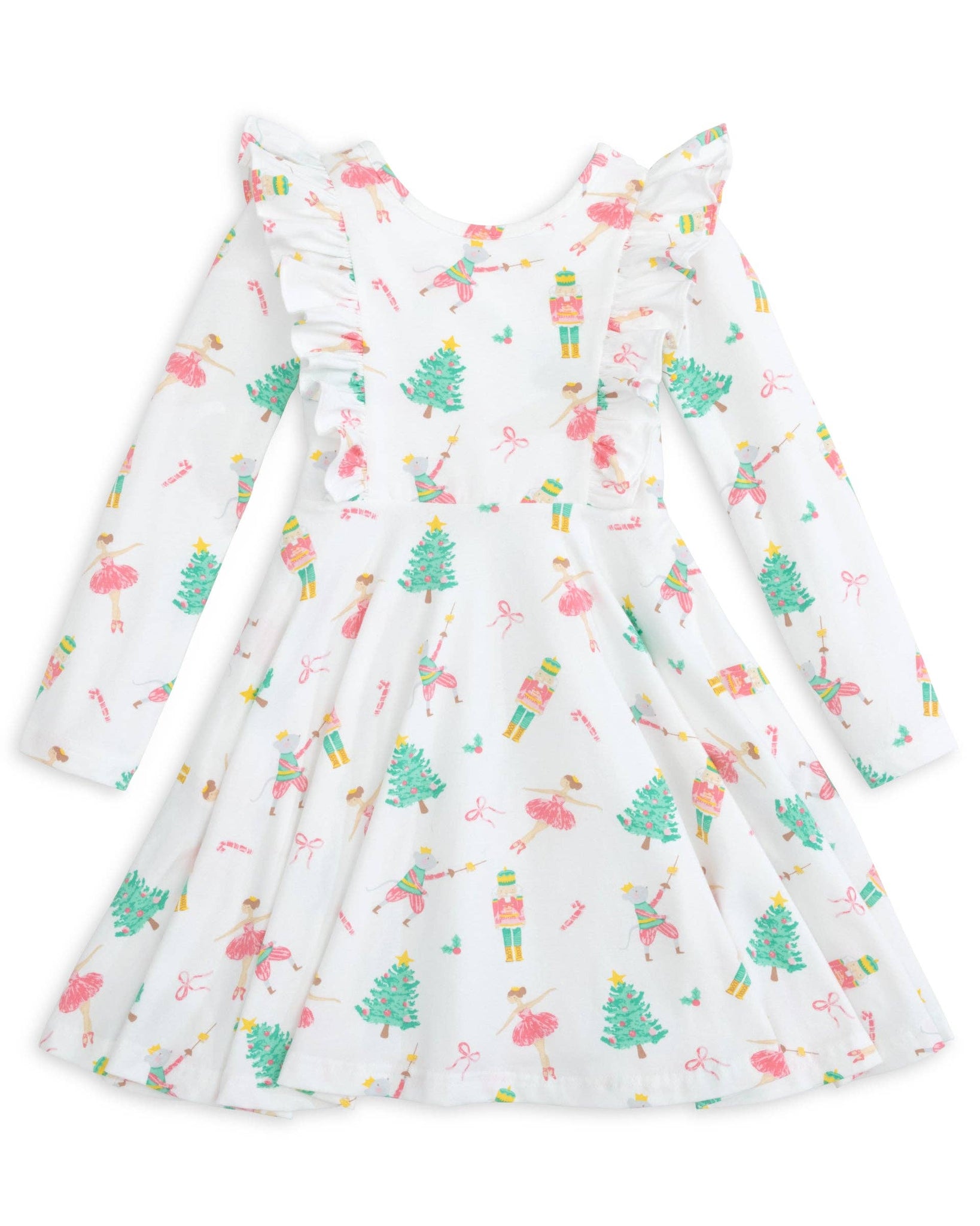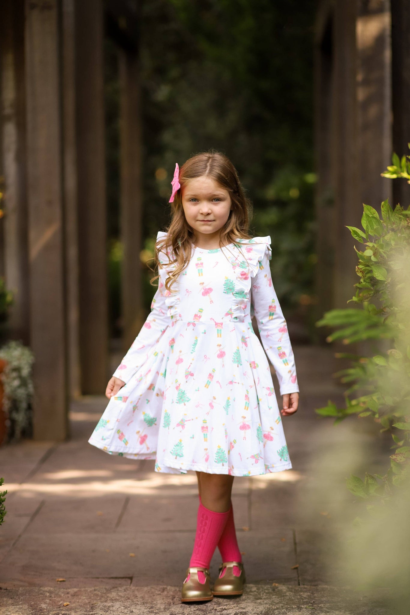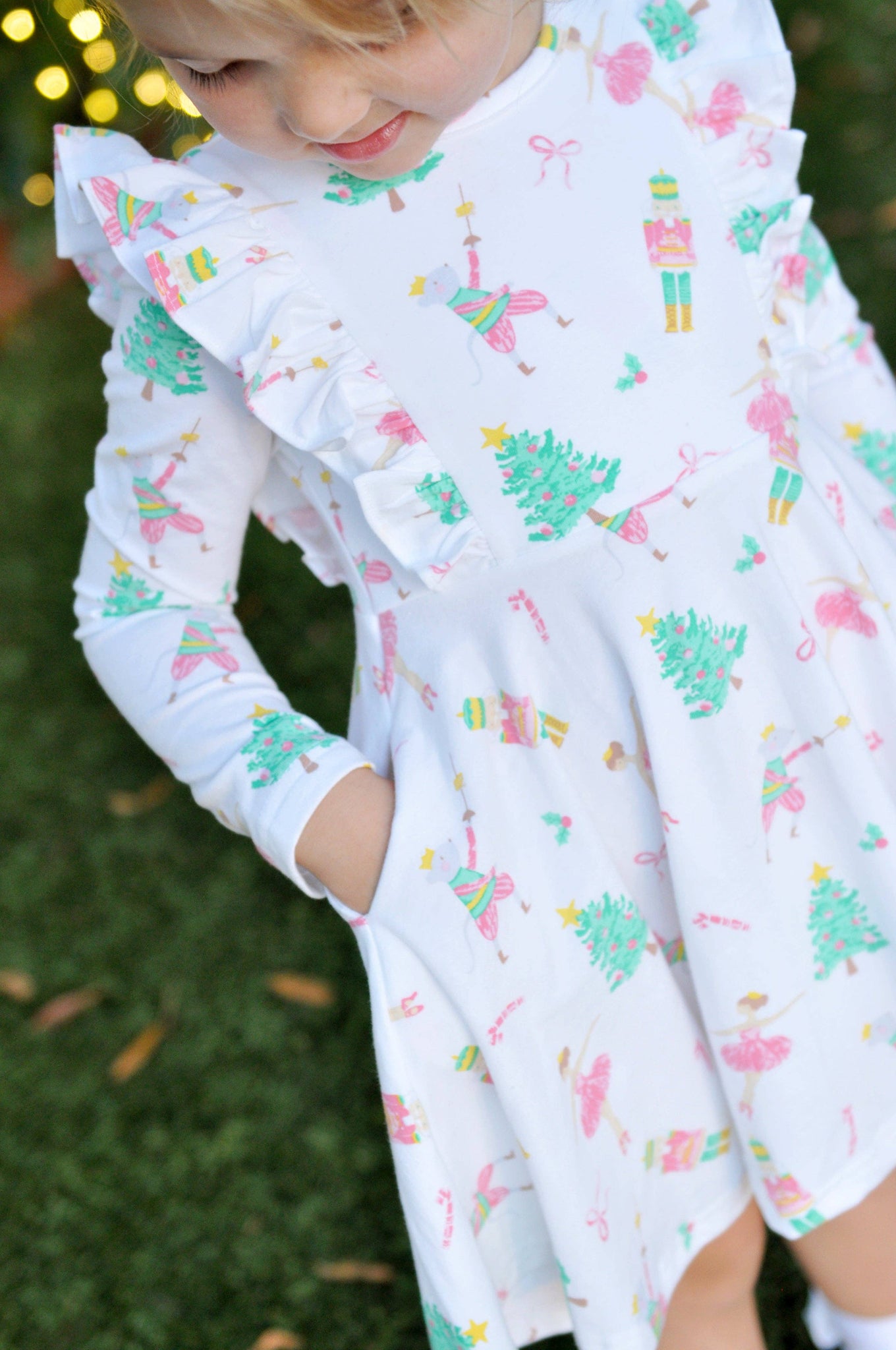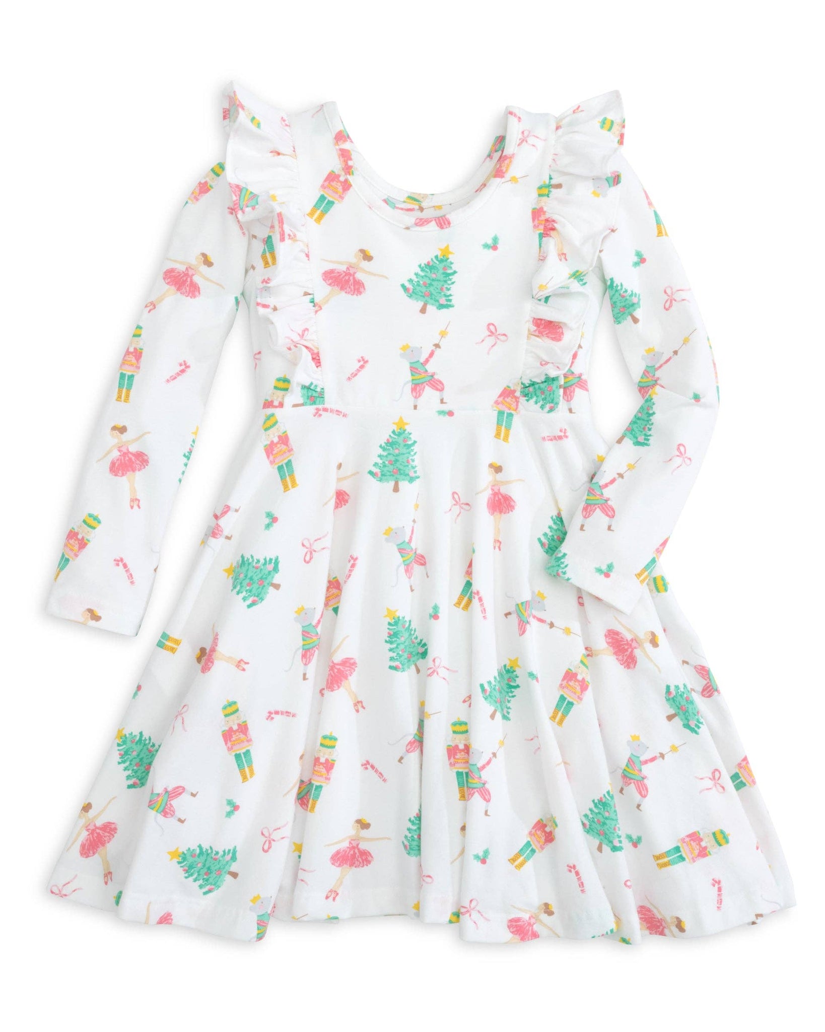 Introducing Clara: the dress perfect for the holiday season! This soft knit dress comes in a festive Nutcracker print, along with fun ruffles over the shoulders and side pockets. The fit and flare silhouette offers a look that's as comfy as it is stylish. Hits at the knee.