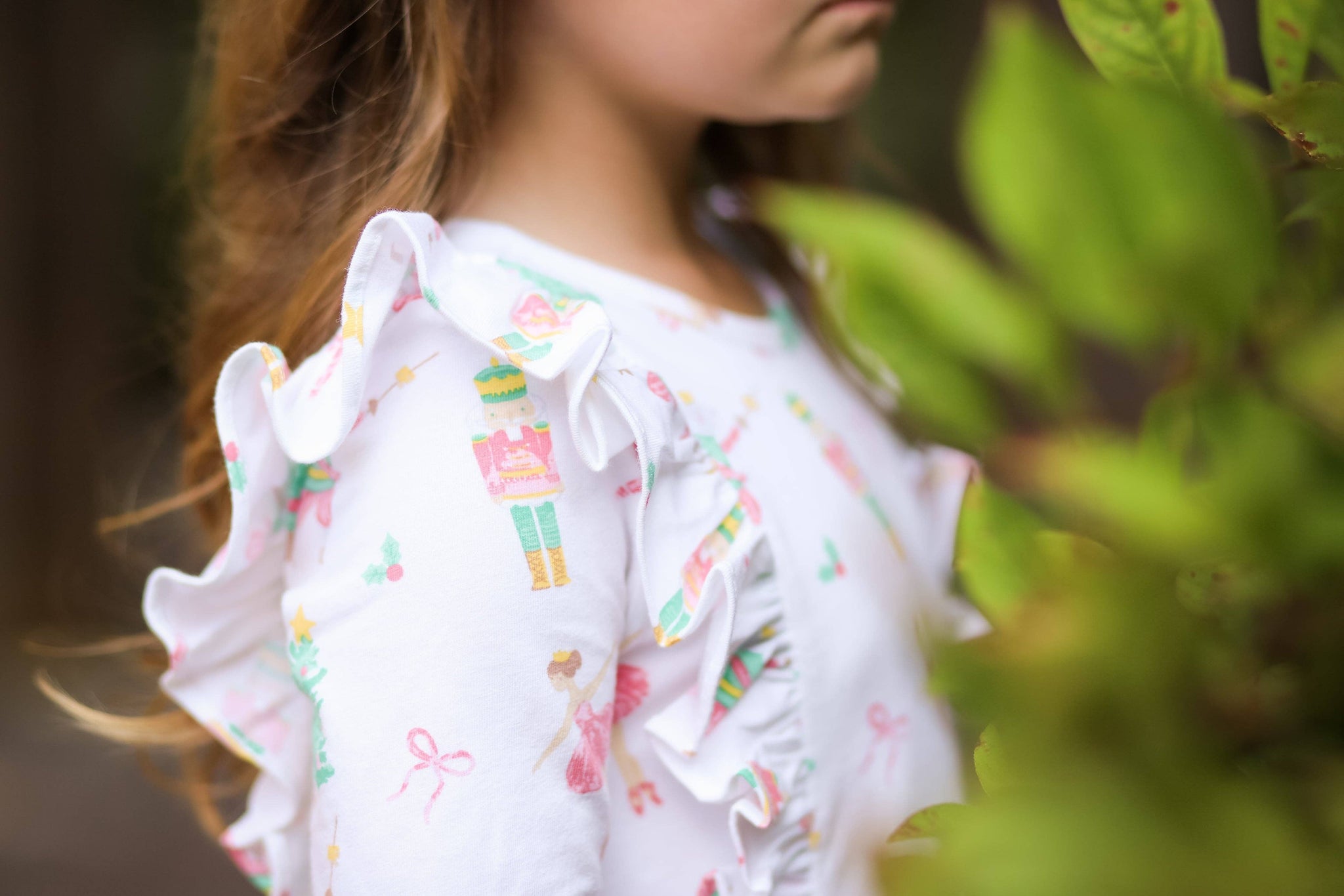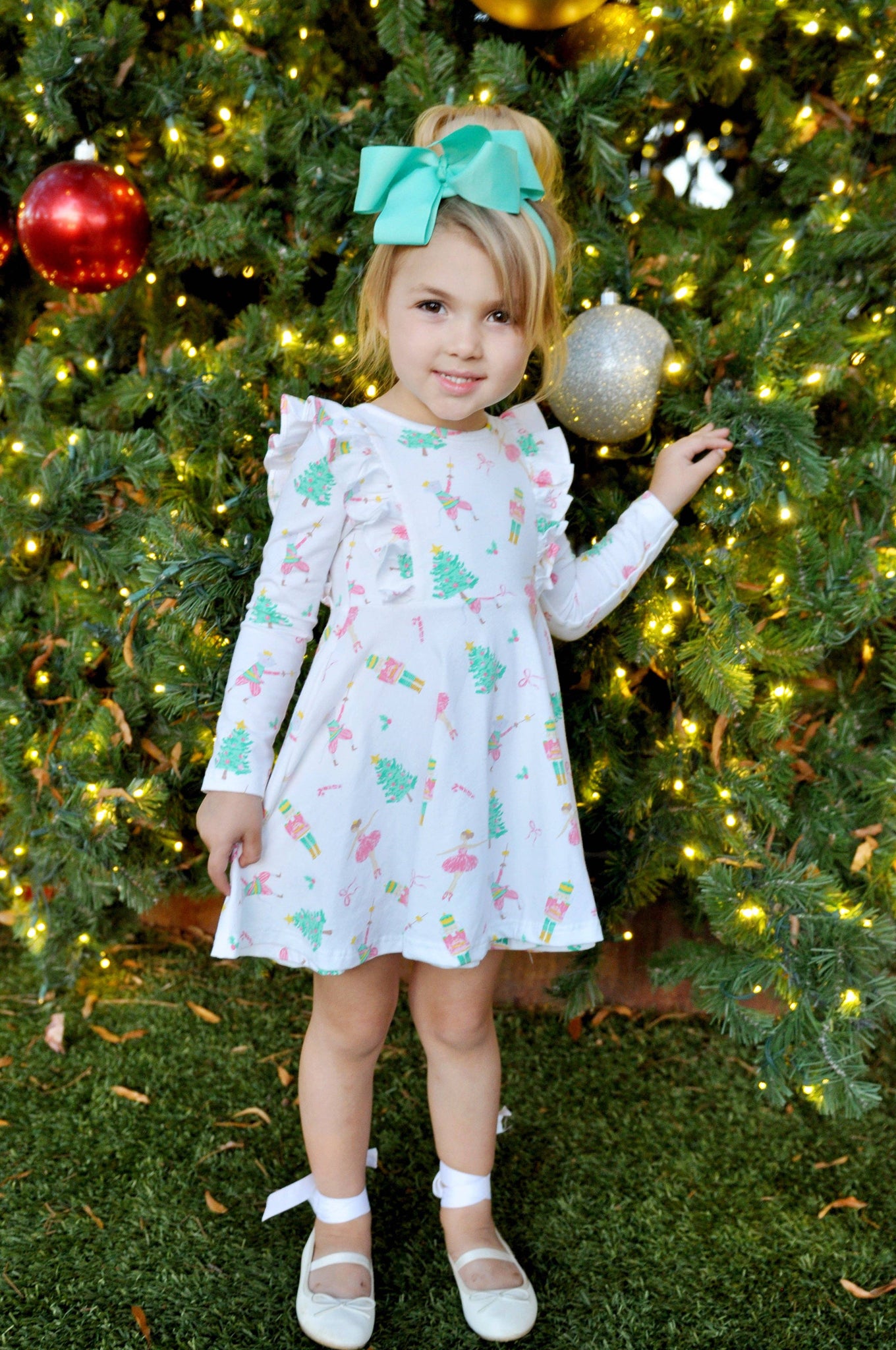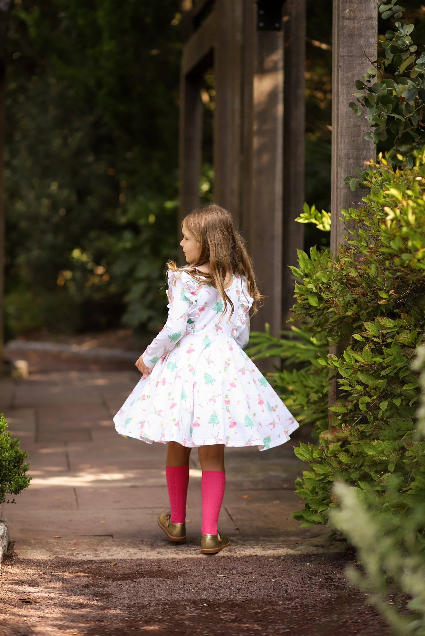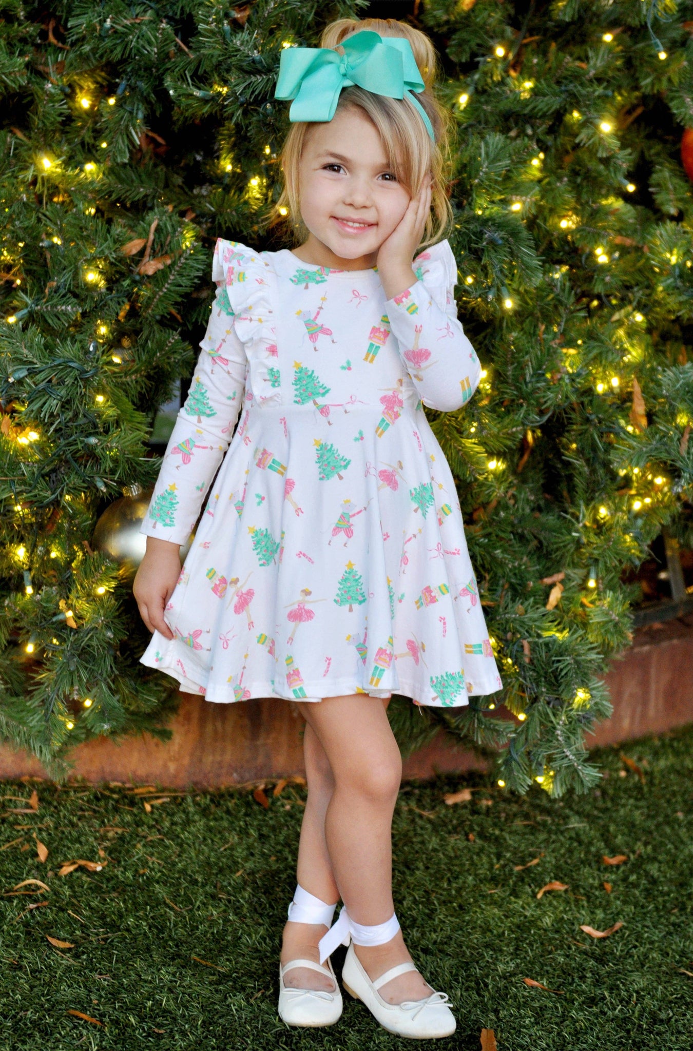 Introducing Clara: the dress perfect for the holiday season! This soft knit dress comes in a festive Nutcracker print, along with fun ruffles over the shoulders and side pockets. The fit and flare silhouette offers a look that's as comfy as it is stylish. Hits at the knee.