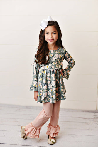 Kids Sage Green & Pink Floral Long Sleeve Ruffle Pant Set