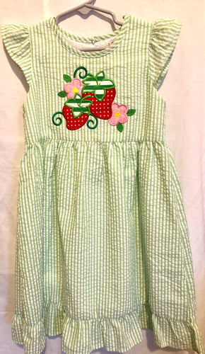 Girls green seersucker flutter sleeve dress with Strawberry applique-6y