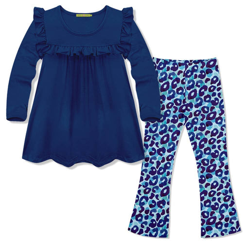 Navy Ruffle Top & Watercolor Leopard Flare Leggings