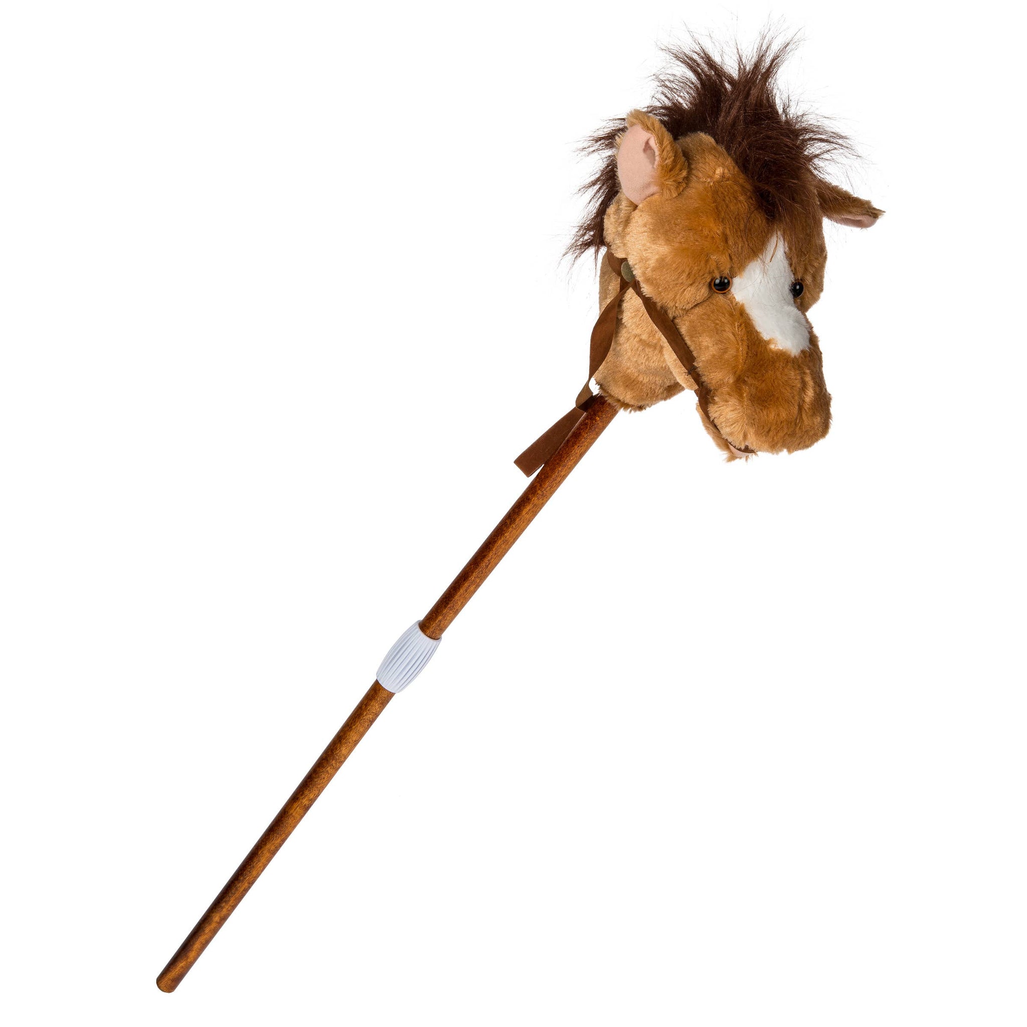 Brown with white trim and measuring 33" from the bottom of the stick to the tip of the head, this stick horse neighs and gallops when you press the right ear. Surface wash; soft toy made to strict quality standards to meet or exceed US Safety requirements.