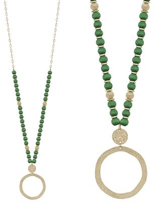 Green Wood Beaded with Hammered Gold Circle Drop Necklace