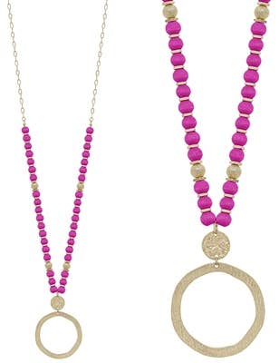 Pink Wood Beaded with Hammered Gold Circle Drop Necklace