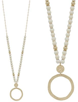 White Wood Beaded with Hammered Gold Circle Drop Necklace