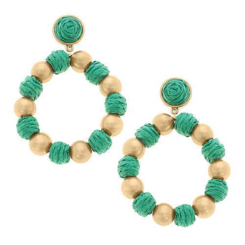 Demi Raffia and Ball Bead Drop Hoop Earring in Green
