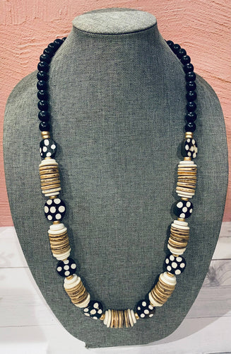 Coconut Wood & Bone Bead Necklace- Black & White Polka Dot