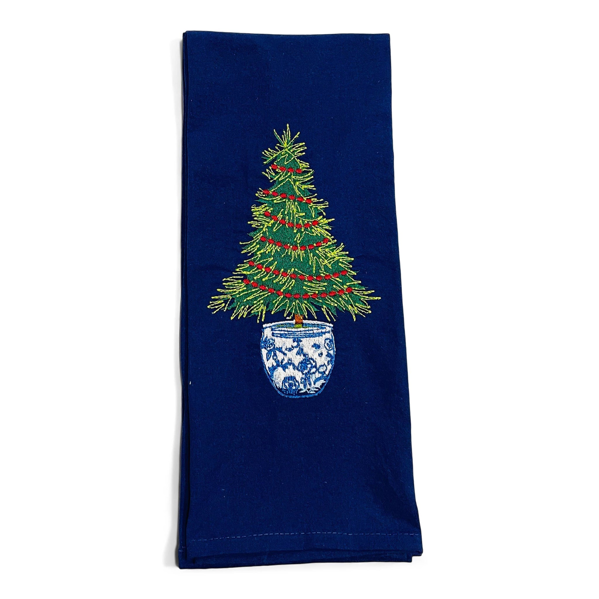From our Chinoiserie collection - the Tree with Ornaments embroidered on a navy towel Size: 27.5" X 27.5" Flour sack dish towel option.